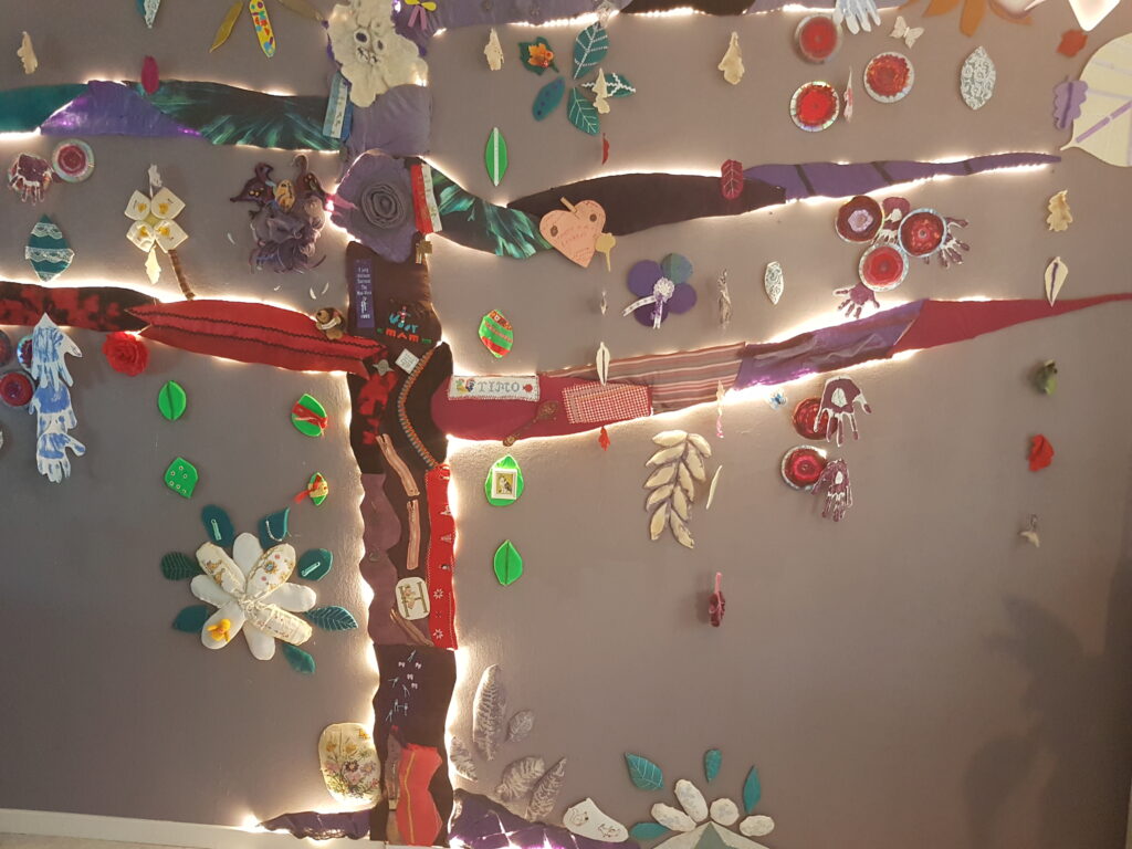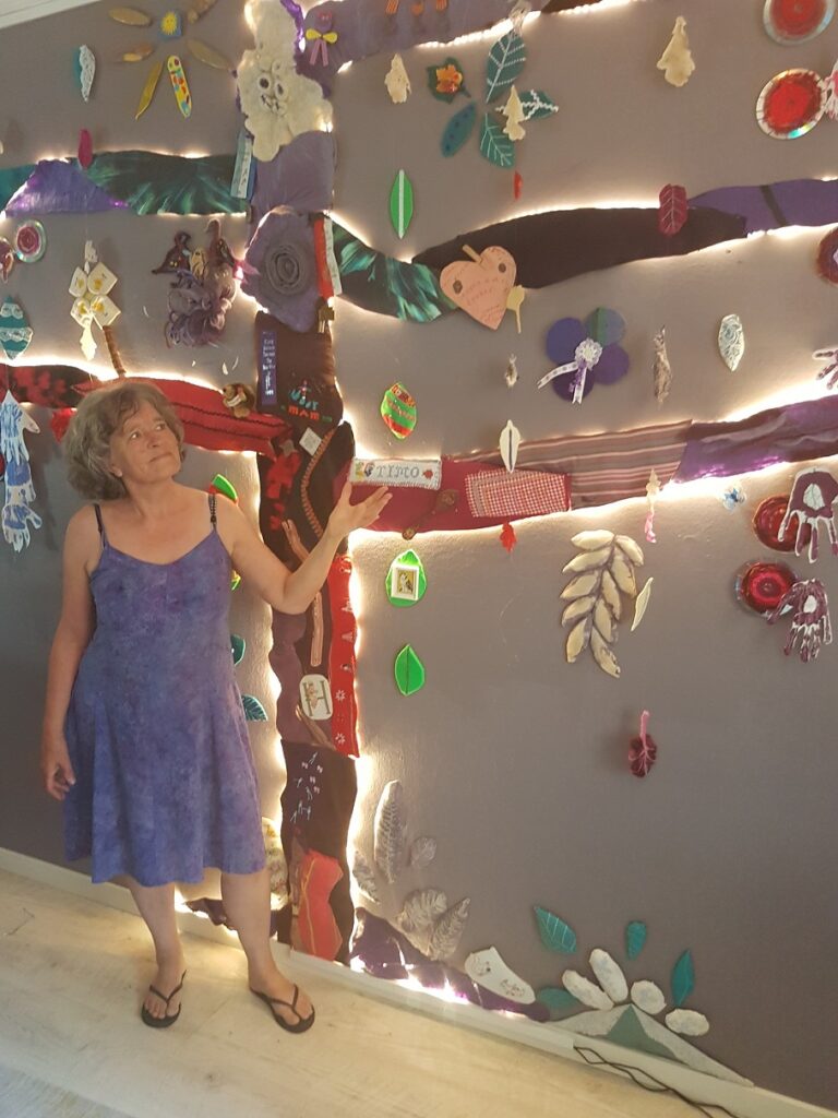 Deze herinneringsboom beslaat een hele muur in de huiskamer. Elk onderdeel van de boom bevat een sterke magneet en de muur is geschilderd met magneetverf. Het is een dagelijkse herinnering aan mijn gezin en onze kinderen. Elke tak bevat herinneringselementen van de kinderen toen ze nog klein waren. Ik kan elk onderdeel verplaatsen en ’s avonds gaan de boomlichtjes aan!