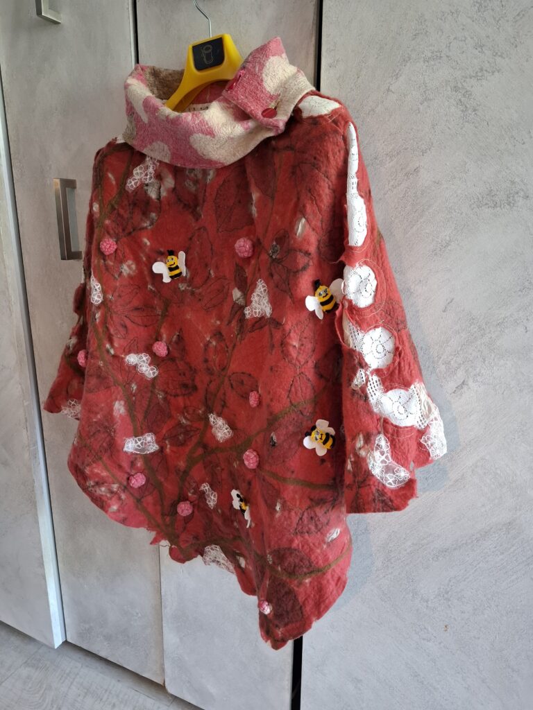 Details: De armlengte is 60 cm. | Voorkant van de col tot onderaan poncho 90 cm. | De middellijn van de kraag is ongeveer 28 cm. | Vilttechniek | Merinowol is heel zacht.